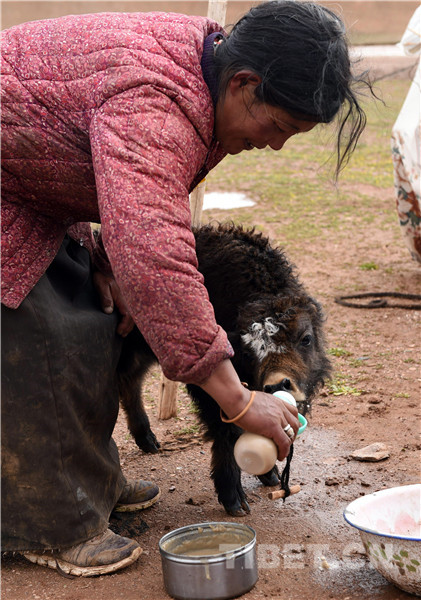 圖為雙湖嘎措鄉(xiāng)才達(dá)卓瑪每天用嬰兒奶瓶在給被狼咬死、失去媽媽的小牛犢喂食。(唐召明2017年7月26日攝)