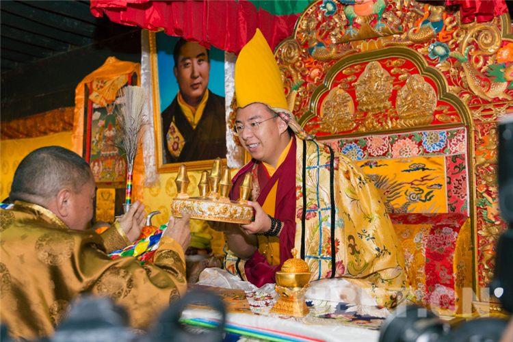 圖為珠康?土登克珠活佛向十一世班禪敬獻(xiàn)曼扎 攝影:鄭朔