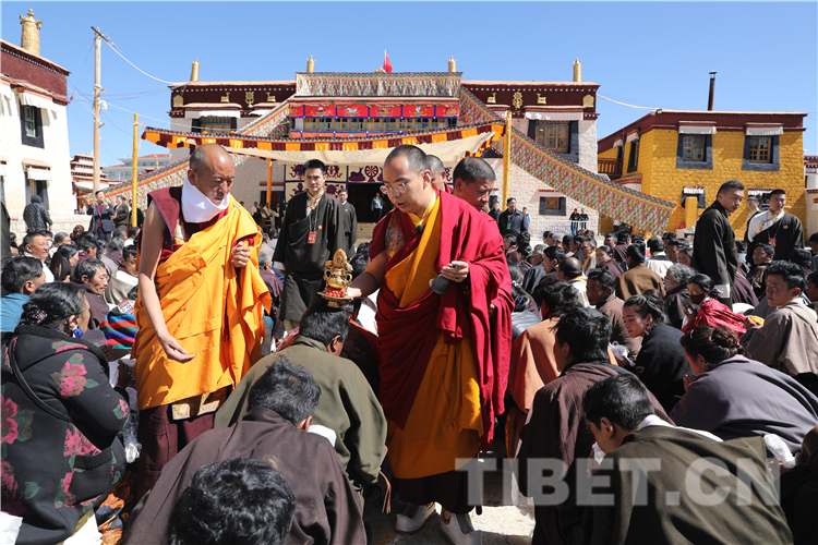 那曲市孝登寺由活佛洛桑尊珠?丹白嘉措始建,距今已近200年歷史。8月9日,十一世班禪前往孝登寺禮佛朝拜,抵達(dá)孝登寺后,珠康?土登克珠活佛向十一世班禪敬獻(xiàn)哈達(dá)。隨后,十一世班禪登上寶座帶領(lǐng)僧眾集體誦經(jīng)祈福,為寺廟僧眾和早早在此等候的信教群眾舉行長壽灌頂、摸頂賜福,為僧俗信眾發(fā)放長壽金剛結(jié)、長壽丸等。