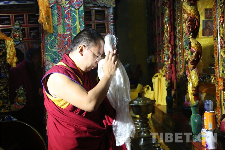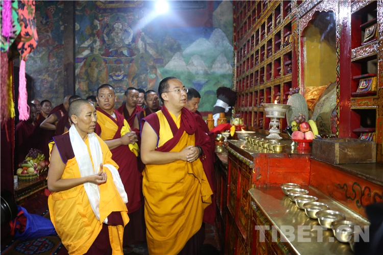 伴隨著裊裊桑煙、陣陣佛樂,十一世班禪緩步走進(jìn)帕巴寺主殿禮佛,并登上主殿寶座。帕巴寺僧尼為十一世班禪敬獻(xiàn)曼扎。稍后,十一世班禪帶領(lǐng)僧尼誦經(jīng)祈福,并為從四面八方趕來、早已在此等候的信教群眾摸頂賜福。
