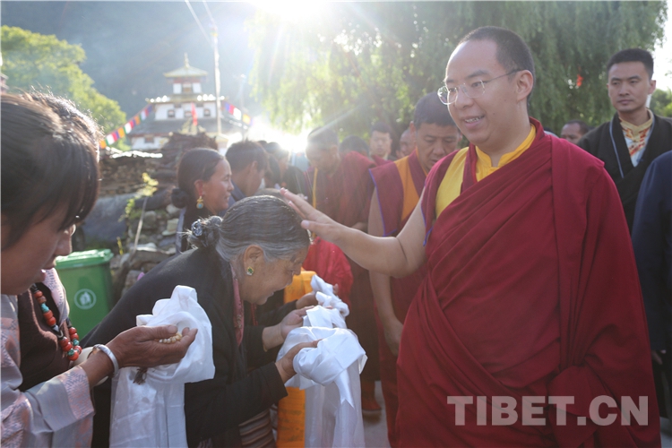 十一世班禪抵達(dá)強(qiáng)真寺,前往主殿朝拜禮佛,并帶領(lǐng)眾僧集體誦經(jīng)祈福。隨后,在寺廟正門為遠(yuǎn)道而來的信教群眾摸頂賜福。信教群眾得到了十一世班禪的摸頂賜福并領(lǐng)到了長壽金剛結(jié)和十一世班禪像,十分幸福和開心,自發(fā)唱起了當(dāng)?shù)氐膫鹘y(tǒng)歌曲,歌聲悠長,充滿吉祥。