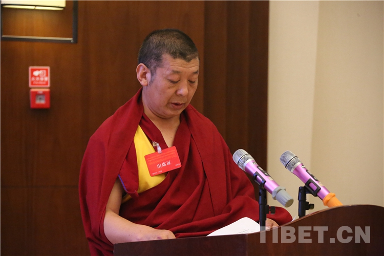 西藏自治區(qū)政協(xié)副主席、中國佛教協(xié)會西藏分會常務(wù)副會長、西藏佛學院院長珠康?土登克珠以“維護祖國統(tǒng)一和民族團結(jié),堅決反對分裂”為題,作教義闡釋演講。