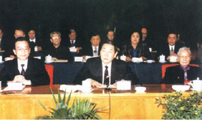 1995年12月,中共中央政治局常委朱镕基代表中共中央出席中國(guó)民主促進(jìn)會(huì)成立50周年大會(huì)并致賀詞。圖為大會(huì)主席臺(tái),前排左起:溫家寶、朱镕基、雷潔瓊 圖片來(lái)源:人民網(wǎng)(中國(guó)西藏網(wǎng) 綜合/孫健 吳建穎)