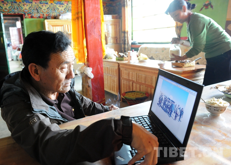 圖為索朗公布從拉薩來到班戈縣青龍鄉(xiāng)姐姐家探親時,沒想到能見到來看望他的老朋友唐召明。這是索朗公布高興地觀看老朋友電腦里的圖片,回憶兩人30年來不尋常的友誼(唐召明2012年8月2日攝)