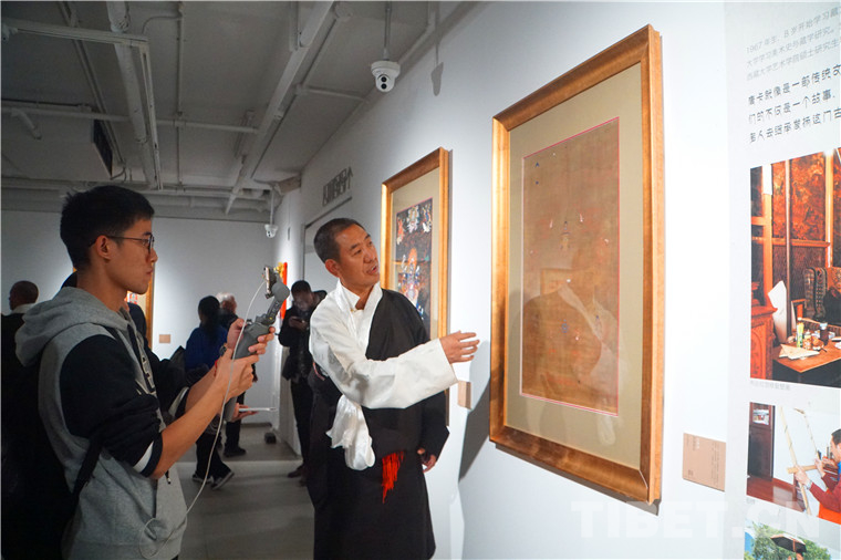 圖為參展唐卡畫家向李小可(右一)介紹畫作 攝影:王茜