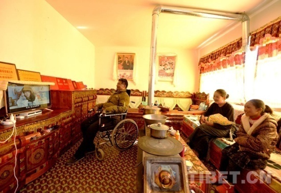 圖為安置點村民在家看電視 攝影:盧忠東 (圖片來自中國西藏網(wǎng))