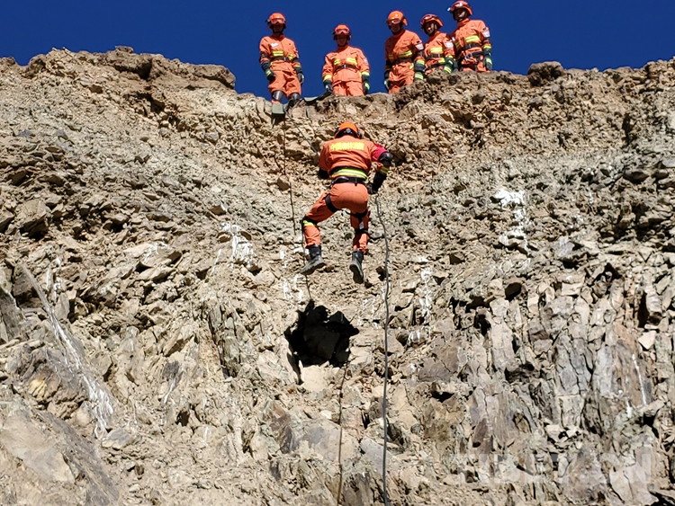 圖為復(fù)雜地形下降訓(xùn)練,進(jìn)一步提高隊員應(yīng)對各種環(huán)境中繩索救援技術(shù)的綜合運用能力