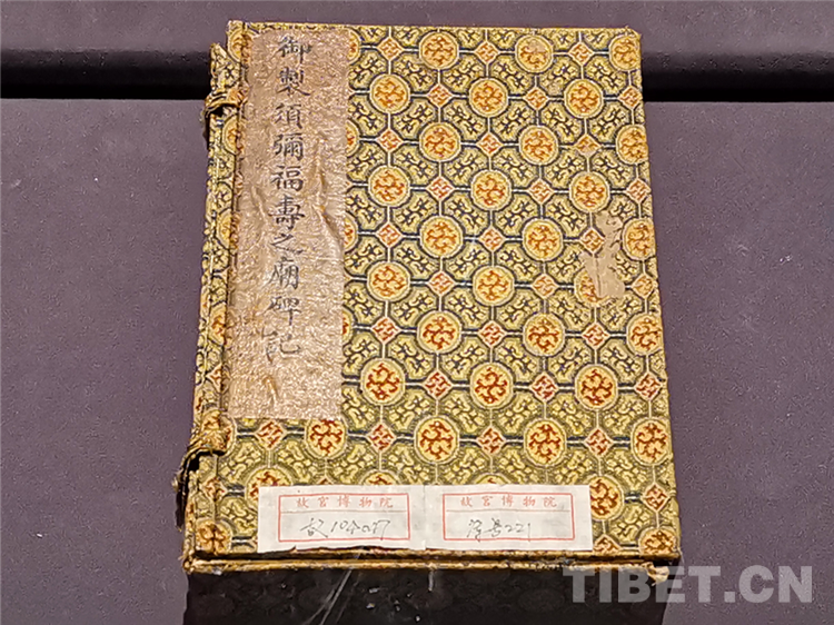 乾隆為迎接六世班禪的到來,特于承德避暑山莊北面獅子溝南坡,仿日喀則扎什倫布寺,建造須彌福壽之廟供六世班禪講經(jīng)和居住。此書冊(cè)記錄了這一歷史。書冊(cè)經(jīng)折裝,上下面板裱織錦,全冊(cè)選用磁青紙以金汁書寫。扉頁(yè)、拖尾頁(yè)分別繪釋迦牟尼佛及韋陀,畫風(fēng)為典型乾隆宮廷風(fēng)格。正文以纏枝花卉紋為框,烏絲欄,一開十行。