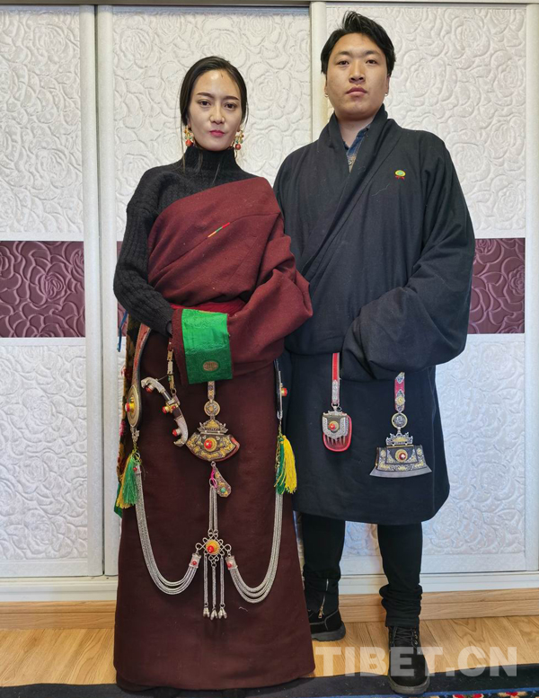 索南旦周最小的女兒叫梅朵,今年23歲,“梅朵”漢語意為“花朵”,她和她的名字一樣漂亮。她是索南旦周家里識文斷字的人。她的老公尕瑪才丁人高馬大,是典型的康巴漢子,他電大畢業(yè)后自主創(chuàng)業(yè),選擇靠祖?zhèn)鞯慕疸y首飾、佛像制造安身立命,在結(jié)古地區(qū)小有名氣。他打制的金銀首飾,精工細(xì)作,一絲不茍,真材實料,信譽(yù)度很好。他們主要接廠家和散戶訂制。梅朵兩口子不善言語,而他倆一帥一美,藏裝上佩戴各式自己打制的金銀裝飾品,是最好的語言和廣告。(中國西藏網(wǎng) 通訊員/才仁當(dāng)智)