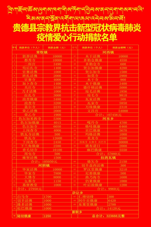 “一方有難、八方支援”。2月7日,隨著疫情防控形勢(shì)嚴(yán)峻復(fù)雜,相關(guān)醫(yī)療物資緊缺,貴德縣佛教協(xié)會(huì)主動(dòng)向全縣佛教界提出倡議,為疫情防控工作伸出援手、獻(xiàn)出愛心。截至目前,貴德縣佛教界共捐款323666元人民幣,為疫情防控奉獻(xiàn)愛心。