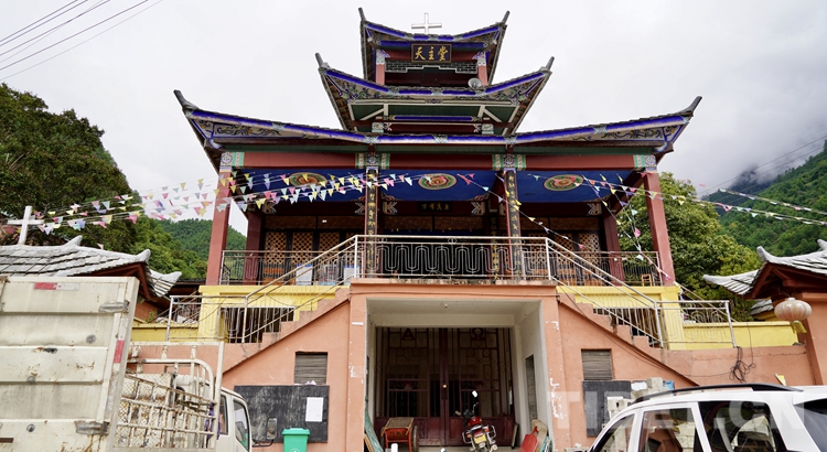 村口正在修路,一條窄窄的小道往山上攀升,3公里后就見到了村子。奇怪的是,村子里一個人也見不著,我們將車停下,正準備下來四處看看,忽然上方傳來整齊的誦讀聲,抬頭一看,我們停車的地方立著一棟中式的仿古建筑,上面掛著一塊豎匾,上書:天主堂。一看日子,今天是星期天,村民們都在教堂做禮拜呢!輕輕地上樓,教堂的大門敞開著,幾十位村民坐在里面,誦讀著圣經。我們靜靜地聽了一會兒,他們開始唱詩,歌詞聽不懂,甚至聽不出是哪種語言。唱完之后村民們突然紛紛站起來,彼此微笑,開始與身邊的人緊握雙手。把身邊夠得著的人的手都握一遍后,又恢復了安靜。我們在后面看得出神,被那種祥和感動。