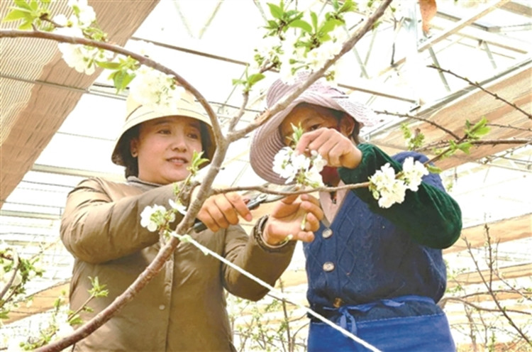 圖為當(dāng)?shù)貏?wù)工人員搶抓農(nóng)時(shí)為果樹疏剪花枝。 拉薩融媒記者 楊 璐攝