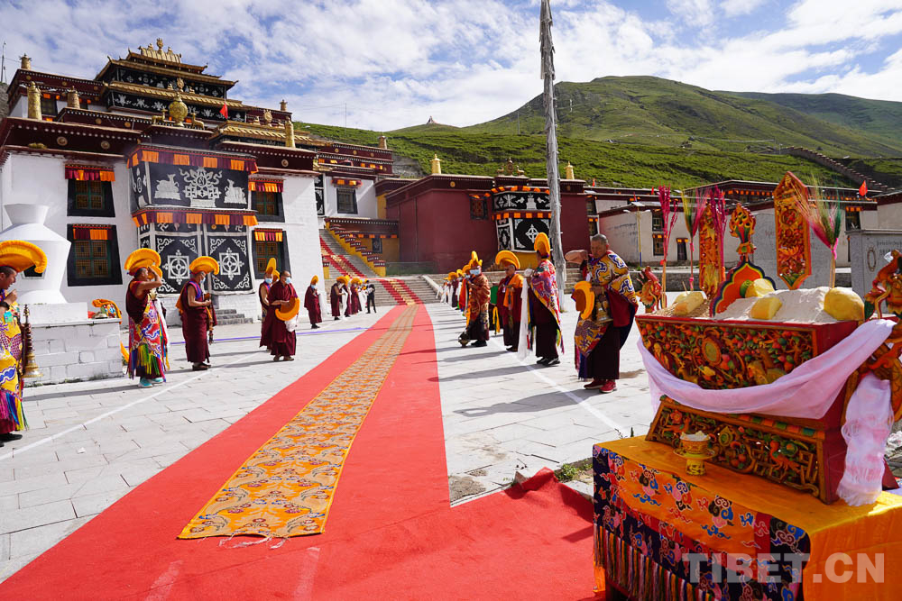為了迎接十一世班禪的到來(lái),索縣贊丹寺也早早地做好了準(zhǔn)備。贊丹寺是藏北地區(qū)最早的格魯派寺院,修建在雅拉多山頂上,外形酷似布達(dá)拉宮。寺內(nèi)珍藏大量的佛像、壁畫(huà)、藏經(jīng)印冊(cè)等,具有很高的文物和藝術(shù)價(jià)值。8月21日,在寺廟僧眾的誦經(jīng)聲中,十一世班禪登上措欽大殿寶座為僧眾摸頂賜福,傳授《達(dá)妥瑪開(kāi)光儀軌》《上師供儀軌》《時(shí)輪金剛祈愿文》。