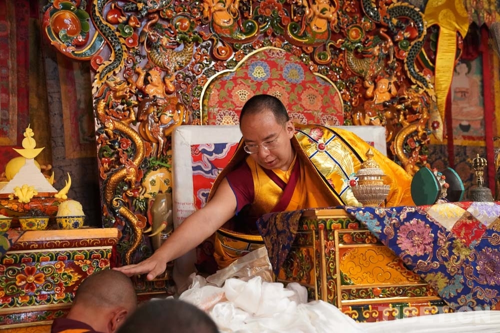 圖為十一世班禪在白嘎寺為僧眾摸頂 攝影:王淑
