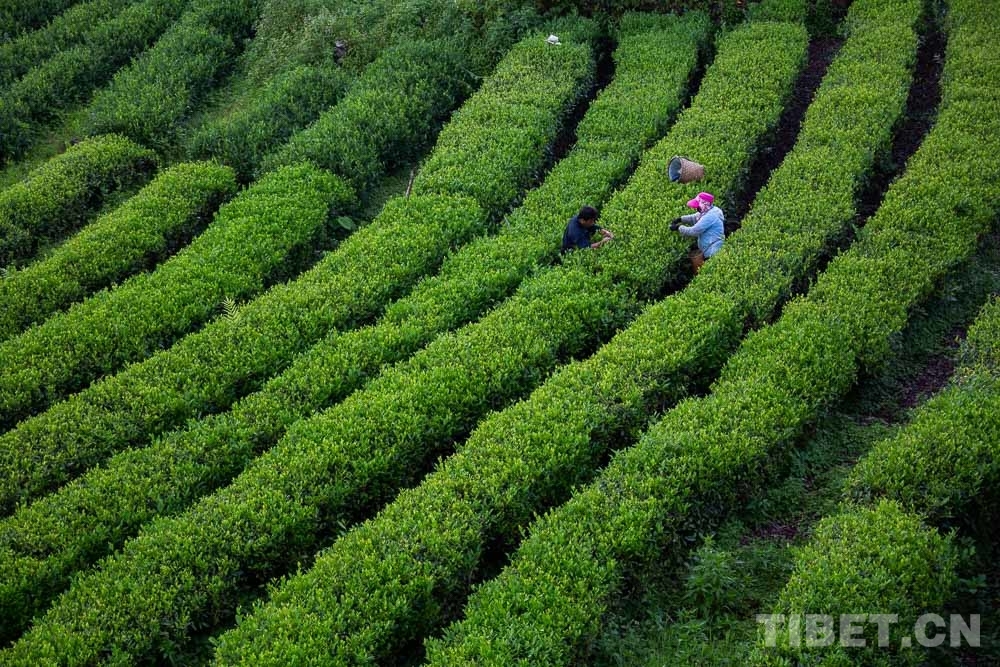 清晨的云霧還未散去,十一世班禪站在平臺之上俯瞰整片茶園,三三兩兩的茶農正在采摘新茶。十一世班禪駐足良久,聽著茶場負責人介紹茶樹的生長狀況等。隨后,十一世班禪走進加工車間,仔細觀看了生產過程,詢問在此工作的當地百姓有多少、通過種茶摘掉貧困帽子的有多少等情況。