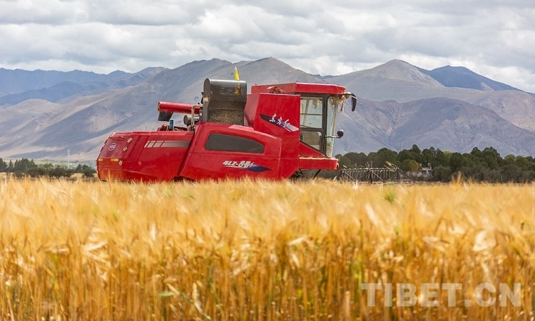圖為聯(lián)合收割機(jī)正在青稞田里進(jìn)行機(jī)械化作業(yè) 攝影:趙耀