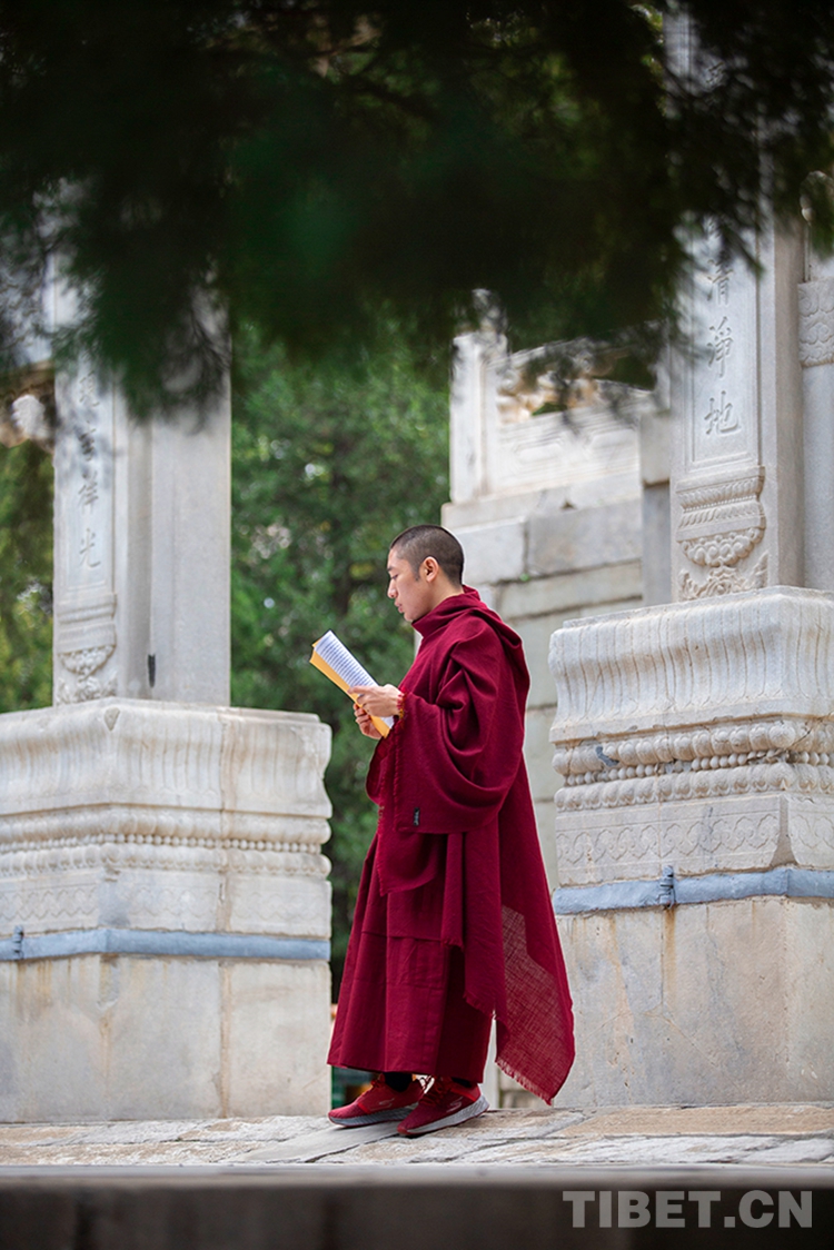 中國西藏網(wǎng)訊 10月29日,深秋的清晨,位于北京西黃寺的中國藏語系高級佛學院內,古柏蒼蒼,清凈肅穆。還有半個小時,2020年藏傳佛教第十六屆“拓然巴”高級學銜畢業(yè)考試辯經(jīng)考試就將準時開始。等待參加辯經(jīng)考試的學僧們,正在西黃寺大殿前誦經(jīng),抓緊時間為考試進行最后的準備。大家或席地而坐,或立定一隅,或踱步前行,梵唱聲聲,余音繞梁。(中國西藏網(wǎng) 攝影/許娜 編輯/周晶)