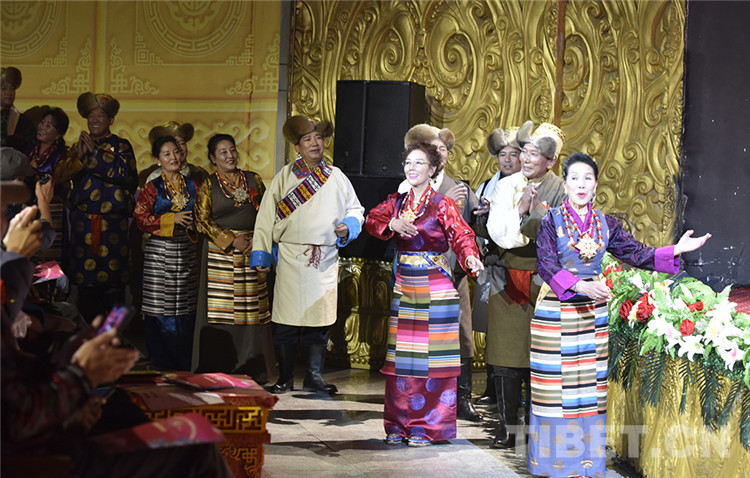 圖為紀(jì)念西藏自治區(qū)藏劇團(tuán)成立60周年藏戲?qū)?chǎng)音樂會(huì)上大央金(右一)等藝術(shù)家登臺(tái)亮相,接受青年演員的致敬 攝影:王媛媛