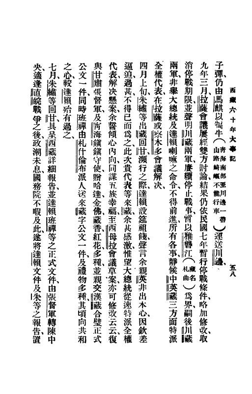 那么,何以后來(lái)出現(xiàn)朱繡為代表團(tuán)負(fù)責(zé)人一說(shuō)呢?原來(lái)朱繡進(jìn)藏前,就“于藏事先后得失情形,了如親歷”“每與談及藏事,批隙導(dǎo)竅,理解豁然”。此次,他赴藏耳聞目睹感受更深,痛感“訌內(nèi)虎紛爭(zhēng),烈烈邊風(fēng)急”。 他在代表團(tuán)的報(bào)告未獲重視后,慮及有關(guān)西藏近代歷史尚無(wú)一可資借鑒之書,而“國(guó)人與政府又太不明了邊事”,決定將西藏近六十年的大事輯為一冊(cè),以供“留心邊事者一助”。他利用閑暇時(shí)間,查找有關(guān)資料,如條約、公文等,并四處奔走,調(diào)查川藏前后戰(zhàn)爭(zhēng)情形,最終于1925年將書印行問(wèn)世,為后人了解和研究西藏這段特殊的歷史時(shí)期留下了不可多得的資料。