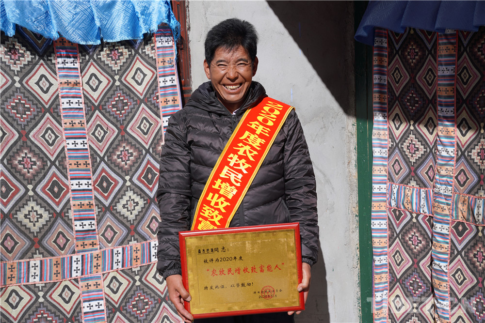 在表彰活動(dòng)現(xiàn)場(chǎng),高掛著特日村首屆農(nóng)牧民增收致富能人表彰活動(dòng)的大紅橫幅。洛桑白珍、尼瑪、格桑頓珠、桑杰巴珠四人身掛“2020年度農(nóng)牧民增收致富能人”綬帶接受表彰。在村“兩委”班子成員為這四人獻(xiàn)哈達(dá)、發(fā)獎(jiǎng)牌和每人500元的獎(jiǎng)金時(shí),現(xiàn)場(chǎng)的氣氛更是達(dá)到了高潮。