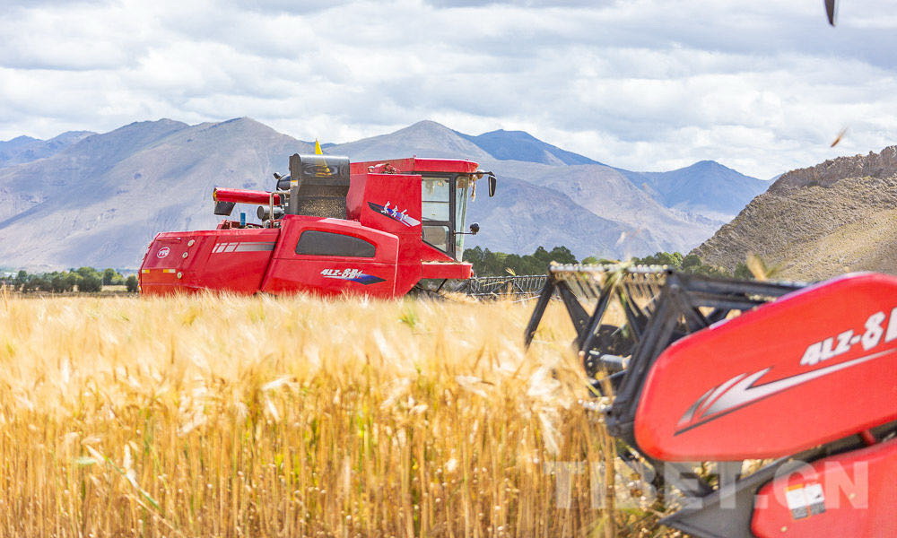 圖為日喀則市江孜縣紫金鄉(xiāng)努堆村機(jī)械化秋收(資料圖)