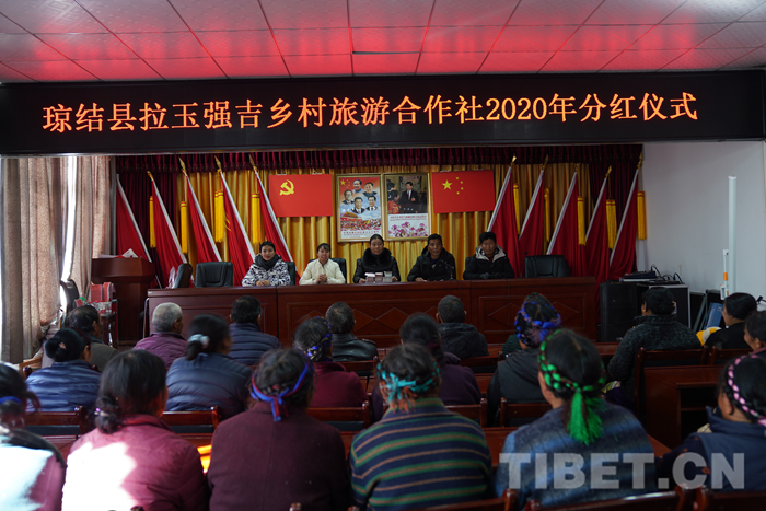 這是拉玉強吉鄉(xiāng)村旅游專業(yè)合作社首次分紅儀式的現(xiàn)場,44戶村民代表臉上掛滿了笑容,準備分享勤勞付出結出的香甜碩果。