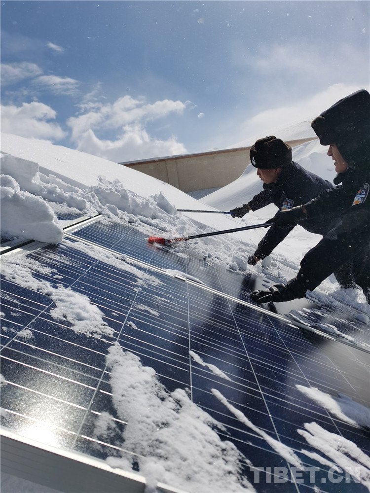 圖為民警們在2019年春節(jié)前遭遇暴雪時(shí)清理太陽能電池板上的積雪