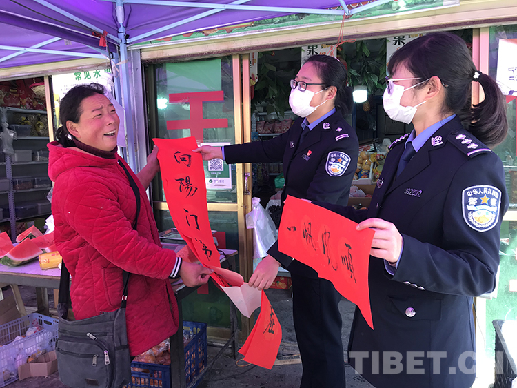 2月7日,拉薩邊檢站邀請拉薩市文聯(lián)書法家協(xié)會共同開展“同心同書——祖國新春好”送萬福進(jìn)萬家活動。4名書法家揮毫潑墨,書寫漢文藏文春聯(lián),散發(fā)著墨香的春聯(lián)凝聚著無限的祝福。隨后,邊檢站格桑花女子執(zhí)勤隊民警為駐地商戶送“?!彼痛郝?lián)。在駐地的一家超市,商戶張大姐興高采烈地與民警一邊貼春聯(lián),一邊笑著說:“感謝你們送來的新春祝福。今年雖然沒能回家過年,但有你們的陪伴照顧,我們感到很開心?!?/p>
