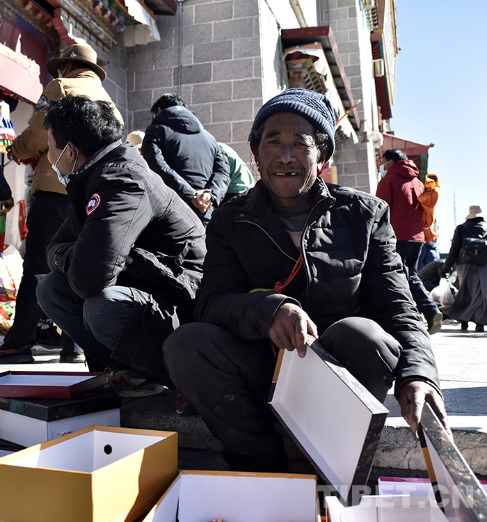 圖為在八廓商城外售賣(mài)酥油花的農(nóng)牧民 攝影:王媛媛