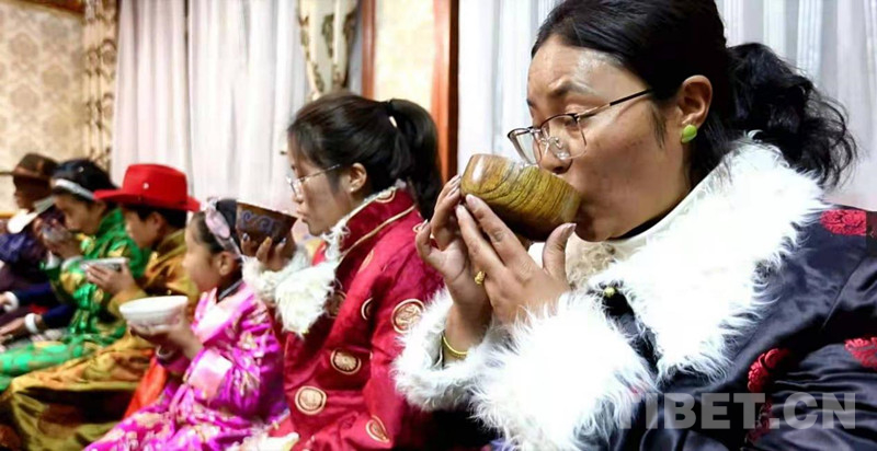 圖為索南旺久一家換上節(jié)日的盛裝一起吃“古突” 攝影:吳學明