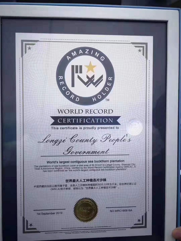 圖為2019年9月1日,山南市隆子縣的沙棘林被世界紀錄認證機構(gòu)(WRCA)認證為“世界最大人工種植連片沙棘”