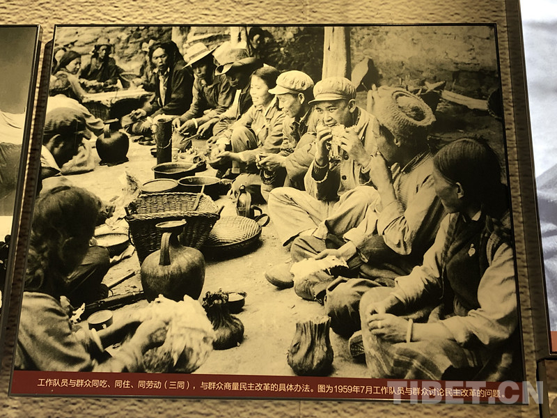 圖為西藏民主改革時(shí)工作隊(duì)員與群眾同吃、同住、同勞動(dòng)。圖片源自拉薩烈士紀(jì)念館