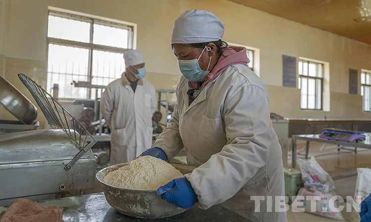 產(chǎn)品加工車間內(nèi),格桑南珠正在和高薪聘請(qǐng)的老師陳周祥一起加工糌粑餅干。“我在這里工作快一年了,在老師的帶領(lǐng)下基本上能獨(dú)立完成糌粑餅干的加工生產(chǎn)了。這里工作一天有170元錢,比在家務(wù)農(nóng)的收入高多了?!?0歲的格桑南珠笑著說。