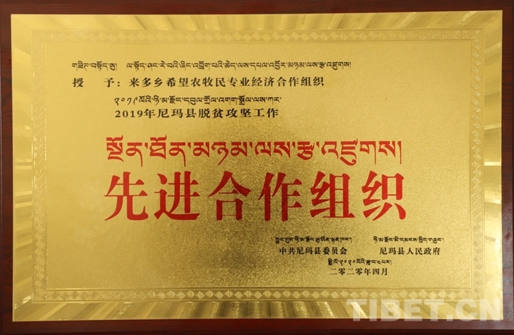 圖為尼瑪縣委、政府頒發(fā)的先進合作組織獎牌
