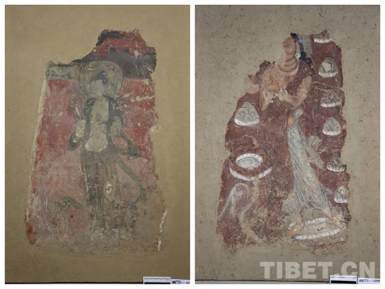 圖為修復(fù)后的表層壁畫(huà)(左)和修復(fù)后的底層壁畫(huà)(右)。原藏于甘肅武威天梯山石窟第 4 窟中心柱,現(xiàn)為武威市天梯山石窟保護(hù)研究所藏