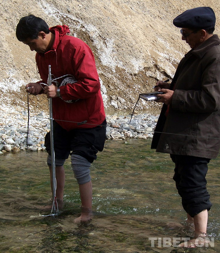 這是時任雙湖特別區(qū)副區(qū)長王暉(左)和區(qū)委書記珠巨(右)在測量建設(shè)中的水電站流速(王暉提供,2007年攝)