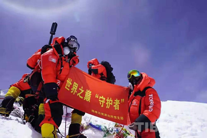 圖為登山隊員在珠穆朗瑪峰展示珠峰邊境派出所黨建品牌