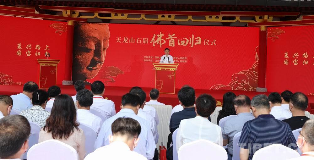 7月24日,天龍山石窟佛首回歸儀式在山西太原舉行。文化和旅游部副部長、國家文物局局長李群,山西省委書記、省人大常委會主任林武為“復(fù)興路上 國寶歸來”特展揭幕,山西省委副書記、山西省人民政府省長藍佛安,山西省委常委、太原市委書記羅清宇致辭,山西省委常委、宣傳部部長呂巖松,山西省委常委、秘書長李鳳岐,佛首捐贈人張榮出席儀式,山西省人民政府副省長張復(fù)明主持儀式。