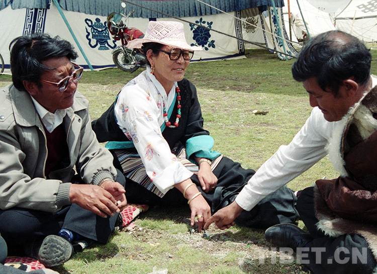 1987年盛夏,時(shí)任那曲地區(qū)(現(xiàn)那曲市)行署副專(zhuān)員的次仁玉珍(中)在那曲賽馬會(huì)的帳篷前,席地而坐與那曲地區(qū)行署專(zhuān)員土登才旺(左)、那曲地區(qū)文化局局長(zhǎng)阿布(右)在交流(唐召明1987年攝)