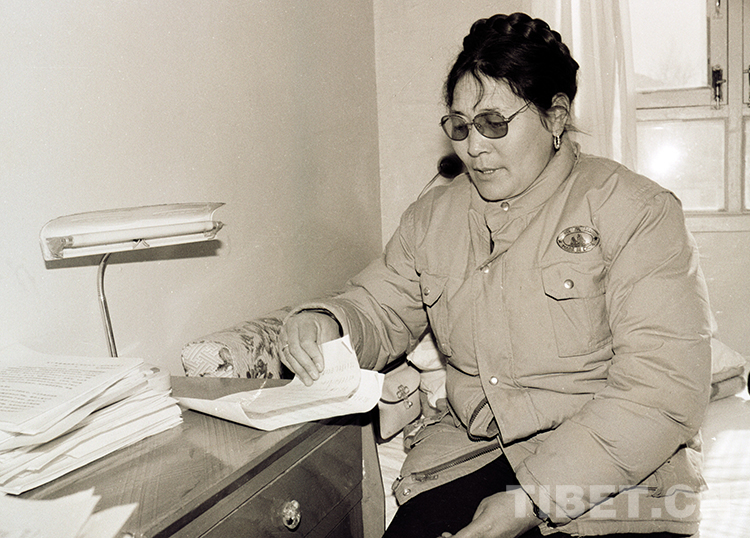 1987年,時(shí)任那曲地區(qū)(現(xiàn)那曲市)行署副專(zhuān)員的次仁玉珍在拉薩參加西藏“兩會(huì)”時(shí),在駐地房間準(zhǔn)備上會(huì)提案(唐召明1987年攝)