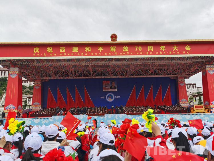 古城拉薩彩旗招展、花團(tuán)錦簇,處處洋溢著歡樂喜慶的節(jié)日氛圍。雄偉的布達(dá)拉宮下,搭建起藏式風(fēng)格的大會(huì)主席臺(tái)。主席臺(tái)上方,莊嚴(yán)的國(guó)徽和“慶祝西藏和平解放70周年大會(huì)”橫幅分外醒目,背景墻上懸掛著大慶會(huì)徽和“1951”“2021”字樣,10面紅旗分列兩側(cè)。主席臺(tái)對(duì)面的布達(dá)拉宮廣場(chǎng)上,身著節(jié)日盛裝的各族群眾從四面八方早早匯聚到這里,揮舞著手中的國(guó)旗、花束,匯聚成一片歡樂的海洋。