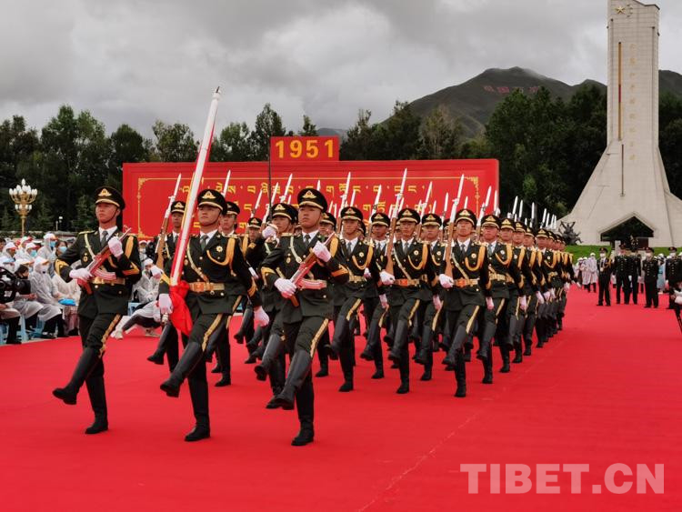 上午10時(shí),齊扎拉宣布大會(huì)開始。全場(chǎng)起立,奏唱國(guó)歌,鮮艷的五星紅旗在布達(dá)拉宮廣場(chǎng)冉冉升起。在熱烈的掌聲中,尤權(quán)宣讀了中共中央、全國(guó)人大常委會(huì)、國(guó)務(wù)院、全國(guó)政協(xié)、中央軍委關(guān)于慶祝西藏和平解放70周年的賀電。