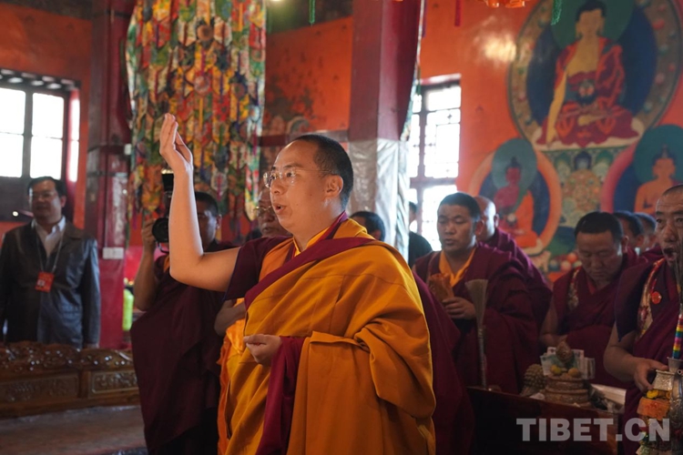 在每所寺院開(kāi)展佛事活動(dòng)時(shí),班禪按宗教儀軌向僧眾發(fā)放布施、供齋茶、齋飯,同時(shí)關(guān)切詢問(wèn)僧人的學(xué)經(jīng)、修行、生活等情況。班禪在講經(jīng)、闡釋教義的同時(shí),多次勉勵(lì)僧眾要適應(yīng)人民群眾向往追求的方向,講好經(jīng),傳好法,做合格僧尼。言傳身教、以身作則,引導(dǎo)寺廟僧尼和信教群眾正信正行。