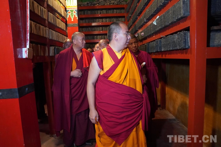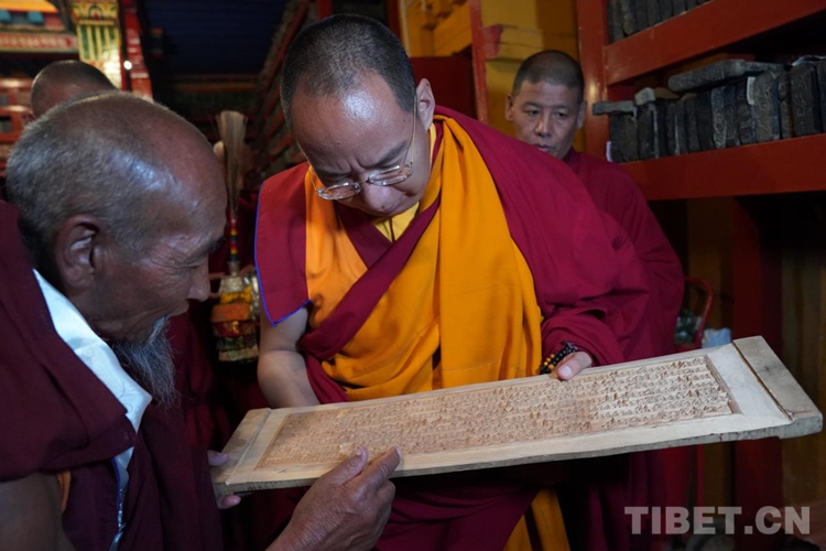 隨后班禪參觀了寺院的印經(jīng)院,納塘寺印經(jīng)院被譽(yù)為“西藏文庫(kù)”。曾刻制印刷大量的藏文經(jīng)典著作。其中包括大藏經(jīng)《甘珠爾》108部、《丹珠爾》225部,都是完整的精刻版,除文字外還有套色版畫(huà)。此套印版的首次印刷本現(xiàn)珍藏于扎什倫布寺和布達(dá)拉宮。