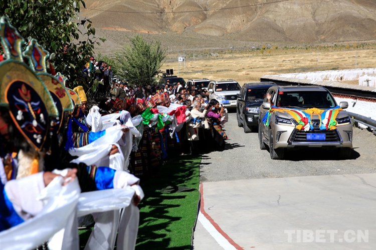 沿途農(nóng)牧區(qū)的信教群眾聞?dòng)嵡皝?lái),身著傳統(tǒng)節(jié)日盛裝、手捧潔白哈達(dá),隊(duì)伍綿延數(shù)里,虔誠(chéng)迎候班禪的到來(lái)。每當(dāng)遇到前來(lái)迎接的信教群眾,班禪便示意車輛緩行,開(kāi)窗向信眾揮手致意,氣度不凡又格外親切。
