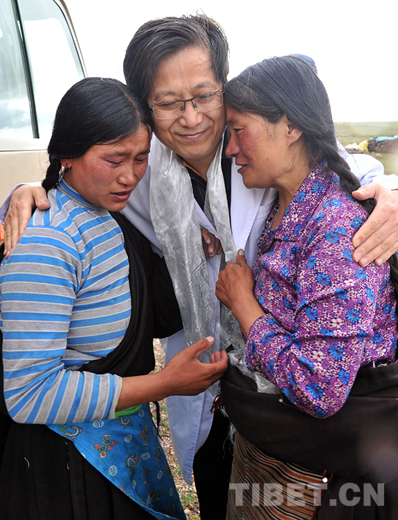 這是曾為斯求卓瑪進(jìn)行手術(shù)的北京口腔醫(yī)院口腔頜面外科主任韓正學(xué)來(lái)到西藏自治區(qū)那曲市班戈縣新吉鄉(xiāng),在為斯求卓瑪作術(shù)后檢查時(shí),卓瑪母女倆奔向韓正學(xué)懷抱相擁而泣(唐召明2015年7月14日攝)