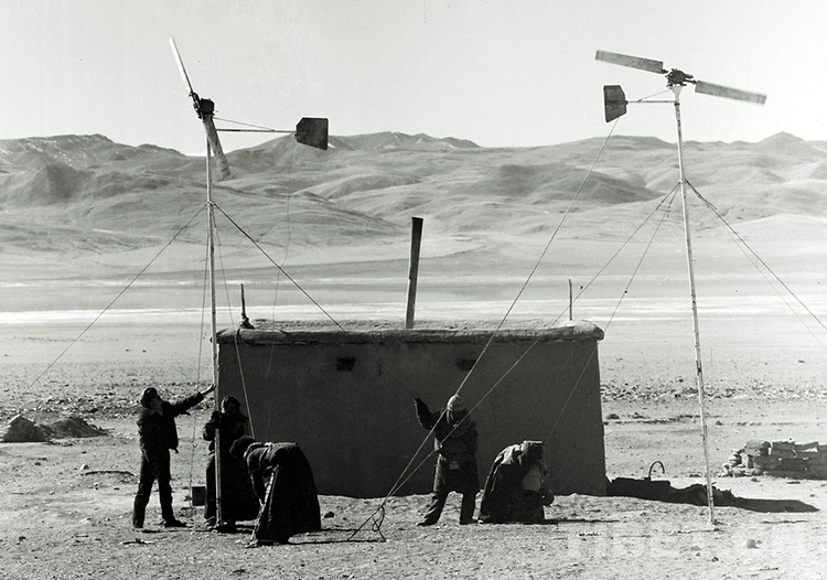 這是那曲地區(qū)風(fēng)能試驗站技術(shù)人員在對那曲地區(qū)雙湖辦事處(現(xiàn)那曲市雙湖縣)嘎措鄉(xiāng)的風(fēng)力發(fā)電機進行檢修保養(yǎng)(唐召明1988年攝)