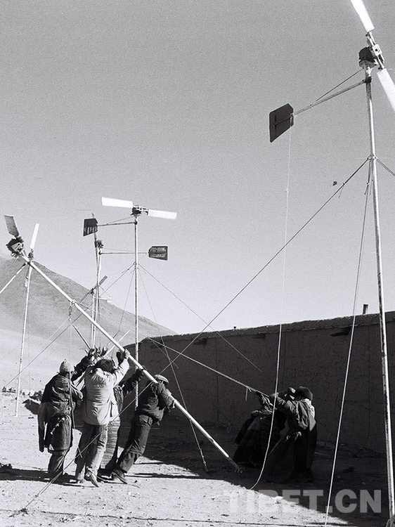 這是那曲地區(qū)風(fēng)能試驗站技術(shù)人員正在豎起剛為那曲地區(qū)雙湖辦事處(現(xiàn)那曲市雙湖縣)嘎措鄉(xiāng)所檢修保養(yǎng)的風(fēng)力發(fā)電機(唐召明1988年攝)