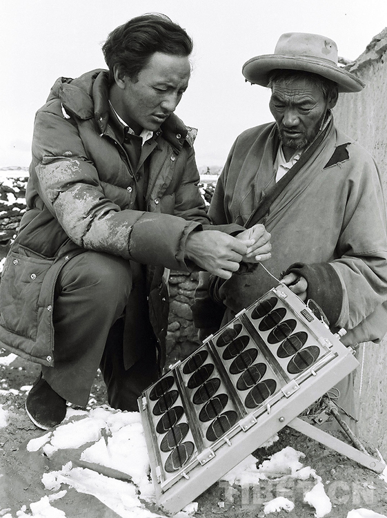 這是那曲地區(qū)風(fēng)能試驗站站長次真在風(fēng)力發(fā)電機試點鄉(xiāng)的那曲地區(qū)那曲縣(現(xiàn)那曲市色尼區(qū))德吉鄉(xiāng)指導(dǎo)牧民群眾使用太陽能硅光電池板(唐召明1987年攝)