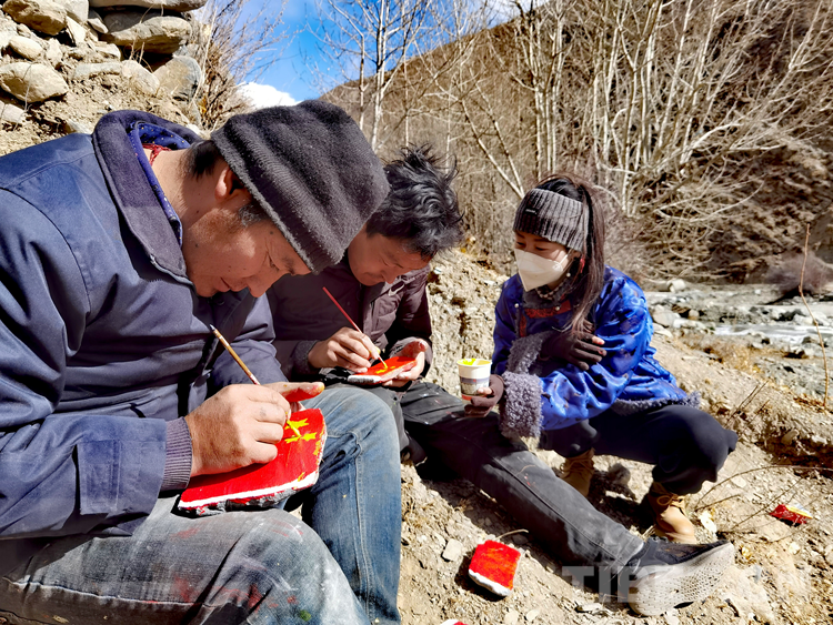 圖為卡熱鄉(xiāng)6個村(居)第一書記及邊據(jù)村駐村工作隊正在石頭上手繪國旗
